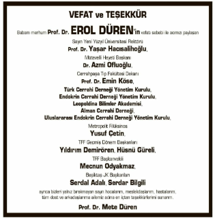 Babam merhum Prof. Dr. EROL DÜREN’in vefatı sebebi ile acımıza paylaşan