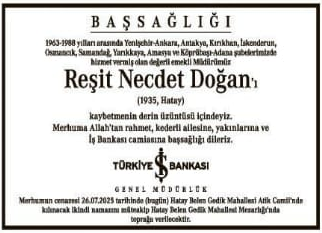Türkiye İş Bankası Genel Müdürlüğü tarafından yayımlanan Hürriyet taziye ilanı, uzun yıllar bankacılık sektörüne hizmet etmiş kıymetli bir isim olan Reşit Necdet Doğan’a yönelik kaleme alınmıştır.
